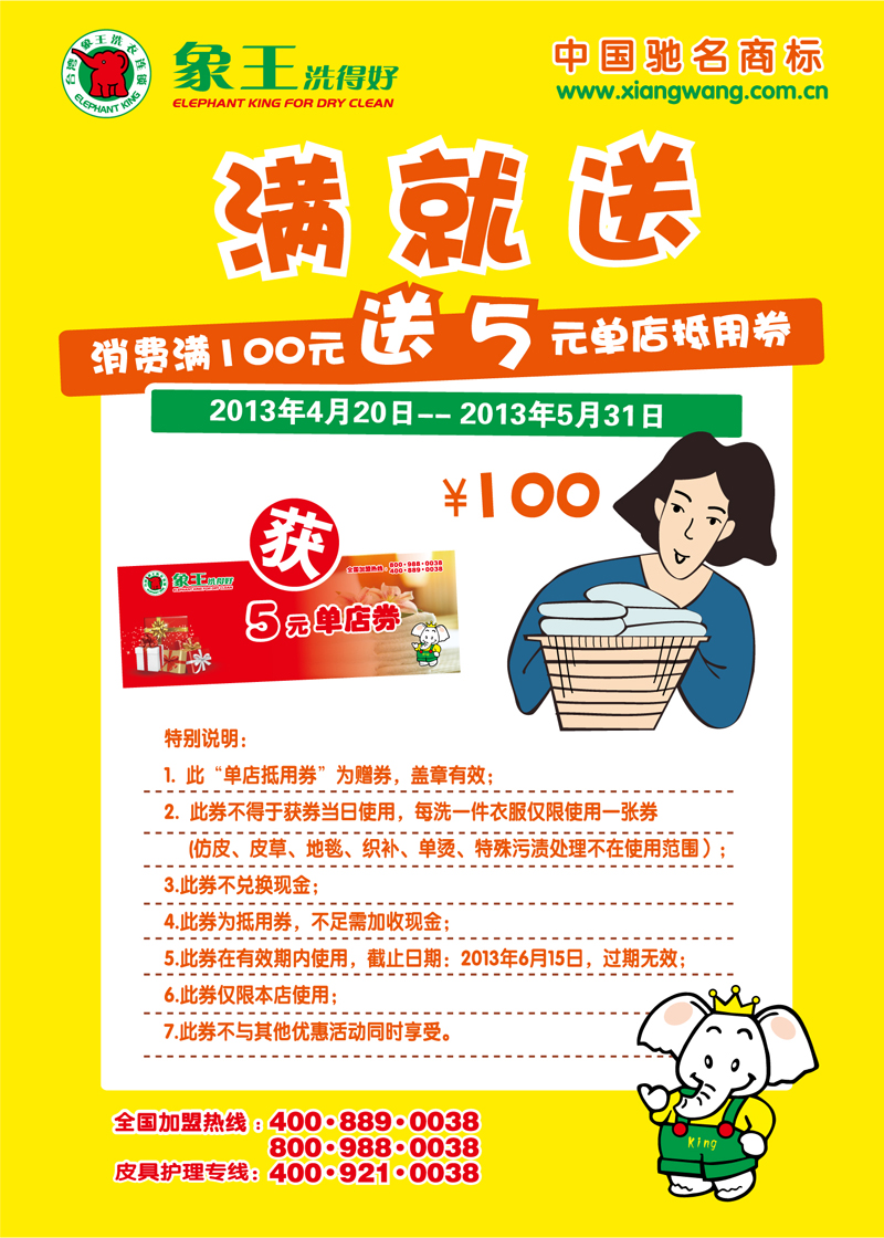 "象王"至今已在全國二十多個省、市、自治區及亞太地 區成功開設了近1000家洗衣連鎖加盟店