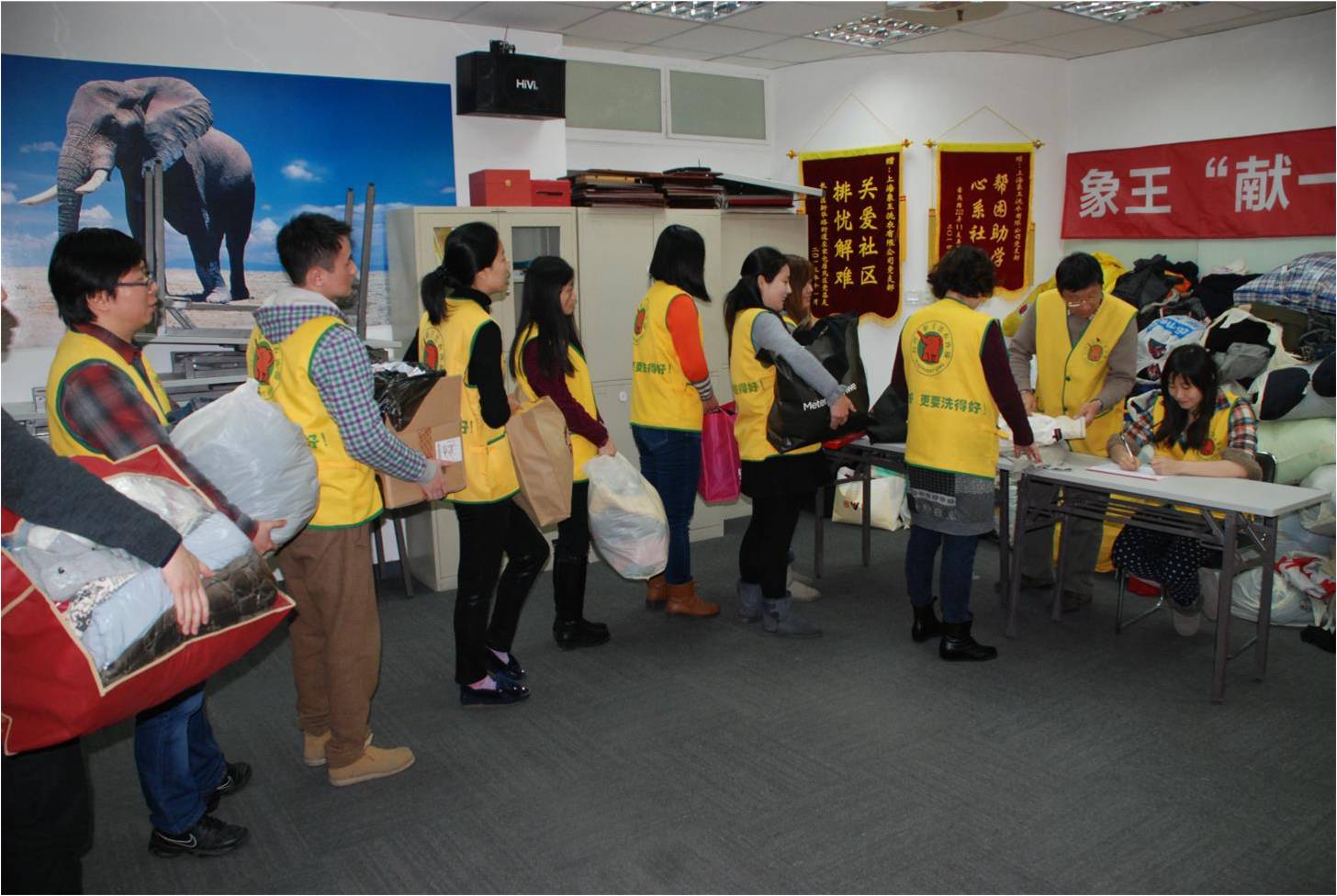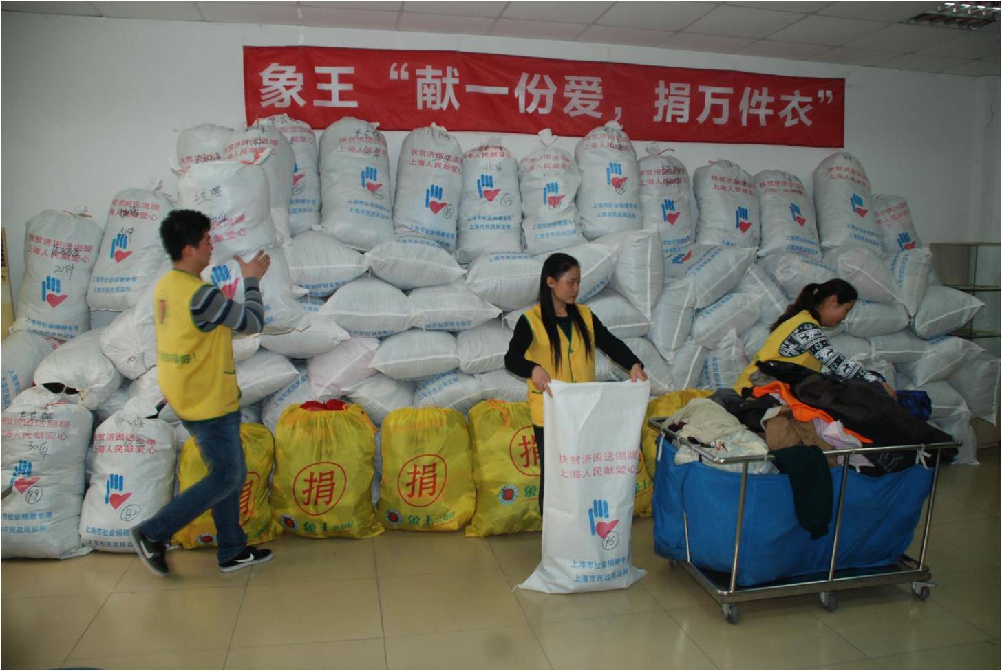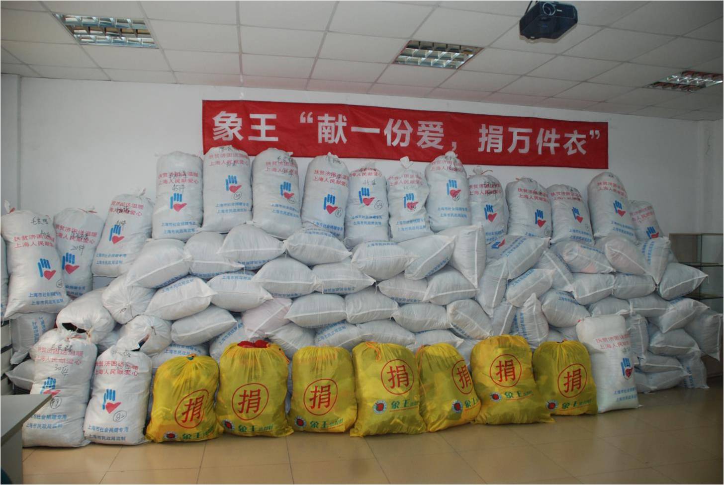 象王在成立15周年慶典之時組織了上海地區(qū)近200家象王門店聯(lián)手消費者共同開展了“獻一份愛,捐萬件衣”的公益活動,很多熱心慈善的市民都加入進來,有市民表示:“大家將心比心,想把自己的一些舊衣服捐贈出來給那些需要的人們,讓他們也度過一個溫暖的冬天。” 象王總部員工也掀起了捐衣的熱潮,氣氛頗暖人心。象王本次公益活動共收到捐贈衣物上萬件,已按時、如約地通過上海市慈善機構將捐贈衣物送往云南貧困地區(qū)。